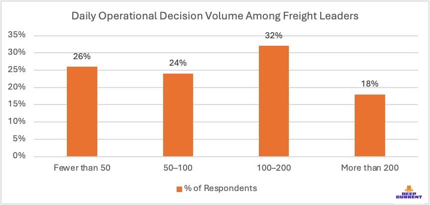 The survey found that 74% of respondents make more than 50 operational decisions per day, while 50% make more than 100 decisions daily. 18% report exceeding 200 shipment-related decisions per day.